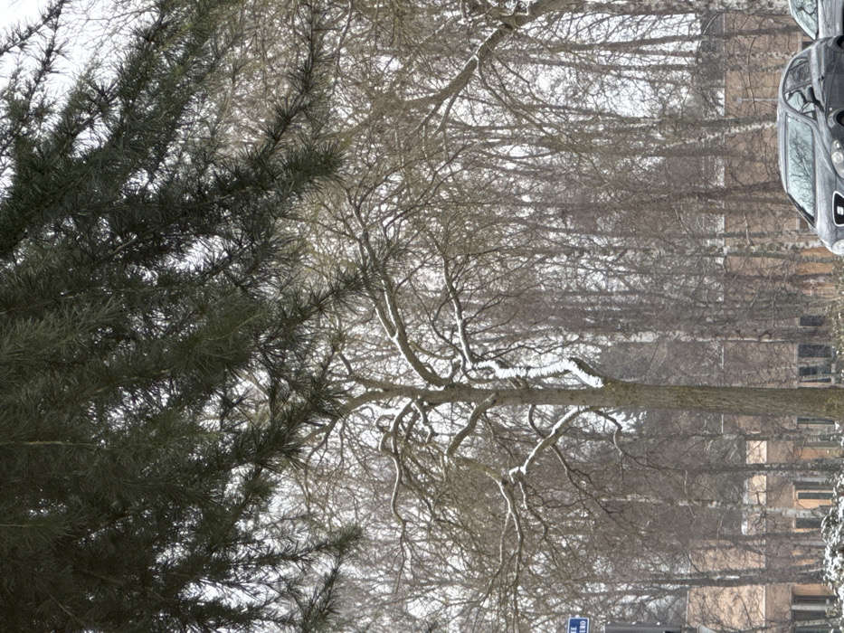 A snowy winter scene is depicted in Oberhausbergen, France, under an overcast sky. Overhead, dark green coniferous branches partially obscure the upper frame. A prominent, snow-dusted deciduous tree stands centrally, flanked by numerous other bare deciduous trees with snow-covered branches. A partial blue street sign, displaying white text 'LE RO', is visible on the left. Behind the trees, light brown buildings with vertical window sections are visible. In the lower right, a dark gray hatchback (identifiable as a SEAT Leon) is parked, partially obscuring a second light-colored vehicle to its right. No human subjects are visible.