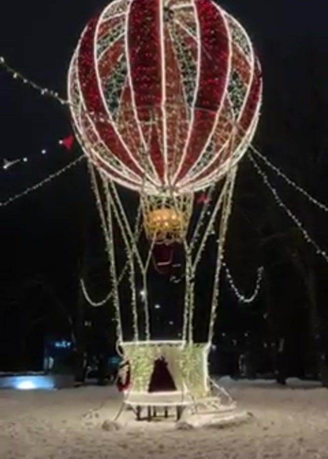 red and white lit hot air balloon decoration in a snowy park at night