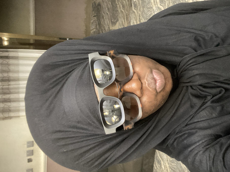 A person wearing a black headscarf and oversized sunglasses faces the camera. The sunglasses have a thick gray frame and the upper corners are a mottled brown. The lenses reflect a light fixture. The person's nose is visible between the lenses and pursed lips are visible on the right side of the frame. The background is out of focus, showing a patterned floor and possibly a door frame.