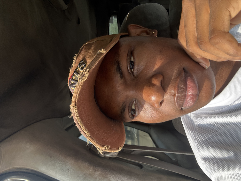 A close-up shot shows a person in a car. They wear a distressed tan baseball cap with colorful stitching. Their hand rests against their face, partially obscuring the background. The person's features are highlighted by sunlight. The car interior is visible with gray seats and portions of the dashboard.