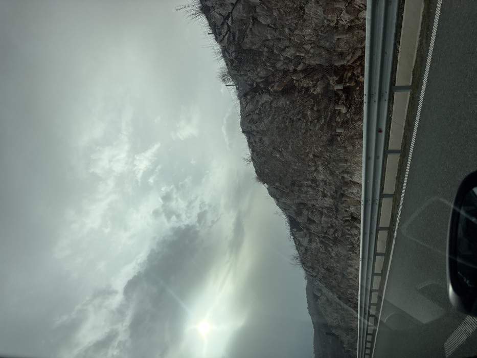 The image displays an outdoor, daytime scene captured from inside a vehicle on a highway or major road in Klopot, Montenegro. The sky is largely overcast, featuring a mix of grey and white clouds. A bright sun, partially obscured, is visible in the upper left quadrant, emitting a strong glare. In the foreground and mid-ground, a paved multi-lane road with white lane markings is present. A silver metal guardrail, supported by vertical posts and featuring a red reflector, runs alongside the road. Behind the guardrail, a rocky slope or cliff face ascends, characterized by grey and brown geological formations. Sparse, dry vegetation, including bare branches, is distributed along the top edge and within crevices of the rock face. A wire mesh system, consistent with rockfall protection, is secured to the upper portion of the cliff with visible posts. Concrete or stone anchors are observed at the base of the rock face behind the guardrail. The perspective includes reflections on the vehicle's windshield in the lower left and a dark side mirror in the lower right, indicating the point of capture. No people or other vehicles are distinctly visible.