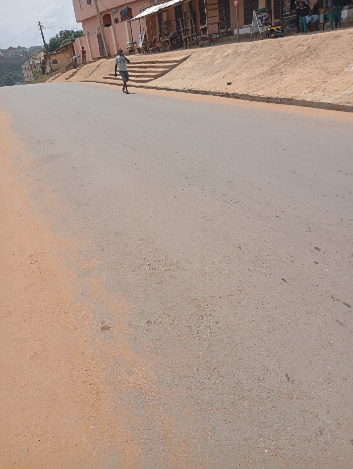 The scene depicts an urban road in Akpaka Forest Reserve, Nigeria, under an overcast sky. A gray asphalt road, partially coated with reddish-brown dust and sand, ascends from the foreground towards the background. To the right, an elevated dirt embankment parallels the road. Beyond this embankment, a series of structures are visible, including a multi-story pink building equipped with a satellite dish, and several single-story commercial shops featuring corrugated metal roofs. In the mid-ground, one male subject, wearing a light-colored shirt with a graphic and dark shorts, is observed walking on the paved road, pushing a small, dark object on wheels. Further along the right, near the commercial structures, approximately four to five individuals are gathered or seated on plastic chairs. One additional individual, dressed in a red shirt, stands near the entrance of the pink building. The far left background reveals distant residential buildings situated on a hillside. Visible objects include wooden display stands, a white A-frame sign, plastic chairs, and a yellow generator located near the shops.