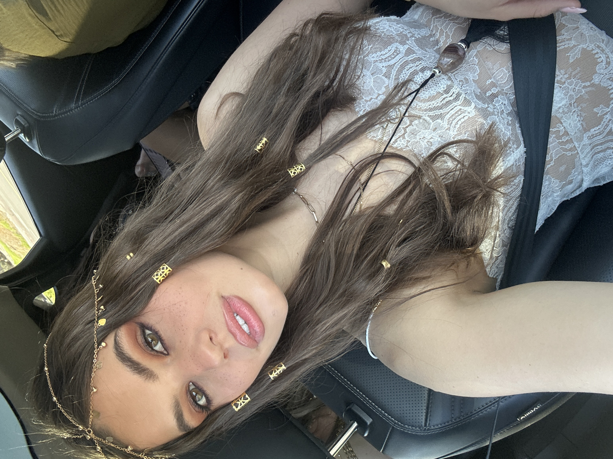 A woman with brown hair, decorated with gold ornaments and a headpiece, is positioned in a black leather car seat. She is wearing a white lace top and a black seatbelt. The image suggests she is inside a vehicle, possibly parked or in motion. The specific location in Rancho Mirage, United States of America, cannot be determined from the image alone.