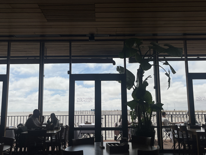 The image displays the interior of a restaurant, "Mostrador Santa Teresita," located in Vicente López, Argentina, facing the Rio de la Plata