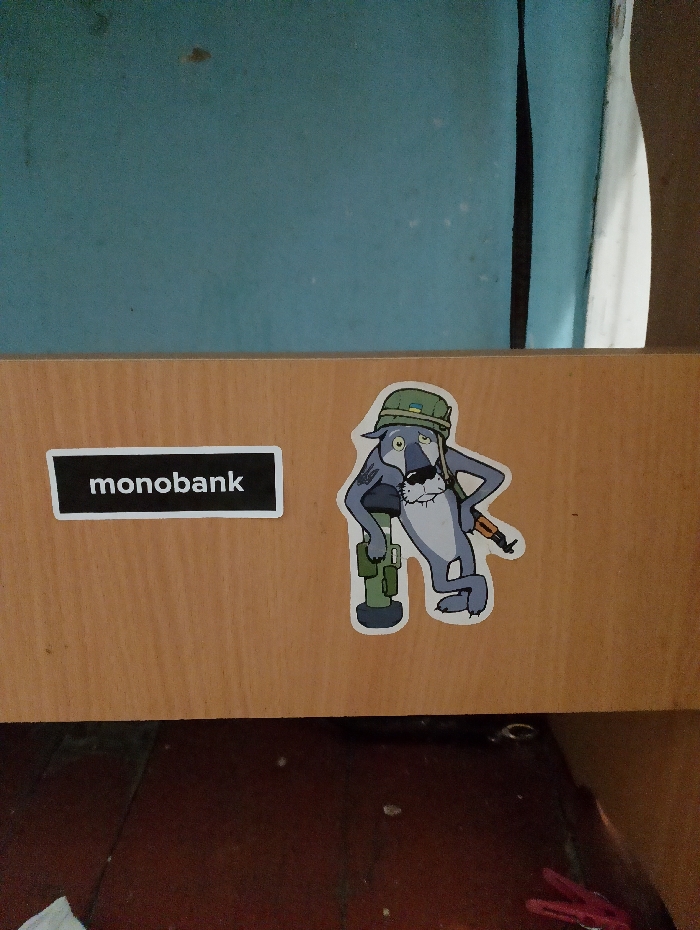 The image displays an indoor scene in Yarun, Ukraine. A light-colored wooden surface, possibly a shelf or desktop, occupies the mid-ground. Affixed to this surface are two stickers. On the left, a black rectangular sticker bears the word "monobank" in white sans-serif font. To its right, a cartoon sticker depicts a grey, wolf-like character with a white beard, wearing sunglasses and a green military helmet featuring a small Ukrainian flag emblem. The character holds a green rocket launcher in its left arm and an AK-style rifle with an orange-brown stock and black barrel in its right hand, resting against its shoulder. The wooden surface is positioned against a light blue wall, which shows minor discoloration and marks. Below the wooden surface, a dark brown floor is visible, sparsely covered with small debris. A metallic ring and two red clips are partially visible on the floor in the lower right quadrant of the image.