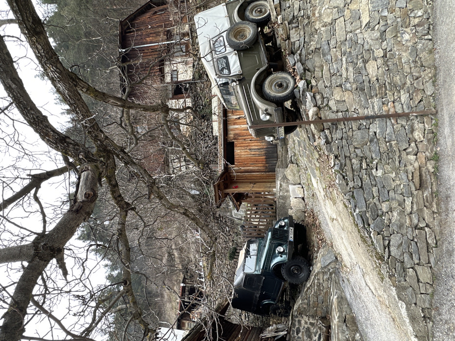 The image displays a steep, terraced landscape in Shiroka Laka, Bulgaria, featuring two vintage off-road vehicles and traditional architectural elements under an overcast sky