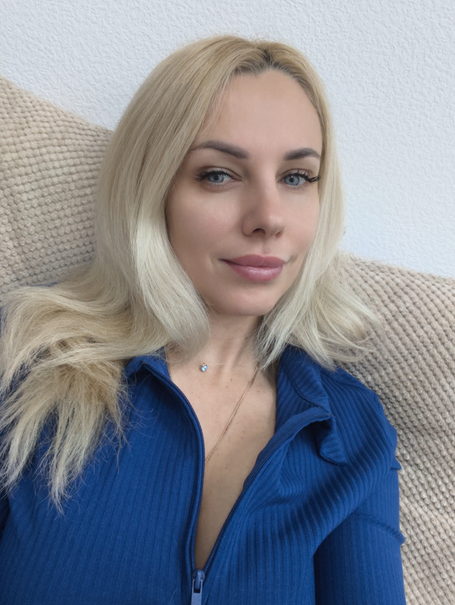 The image displays an adult female in an indoor setting. The individual has long, straight blonde hair, blue eyes, and fair skin, facing directly towards the viewer with a slight smile. She wears a blue, ribbed, long-sleeved top with a central zipper partially unzipped. Around her neck, she has a delicate, thin, light-colored chain and another necklace featuring a small, light blue, oval-shaped pendant. Her left shoulder and a portion of her back are positioned against a light beige, chunky-knit fabric, consistent with a cushion or blanket. The background is a uniformly textured white wall. Visual elements within the image do not provide specific geographic identifiers for a particular location in Sevastopol, Ukraine.