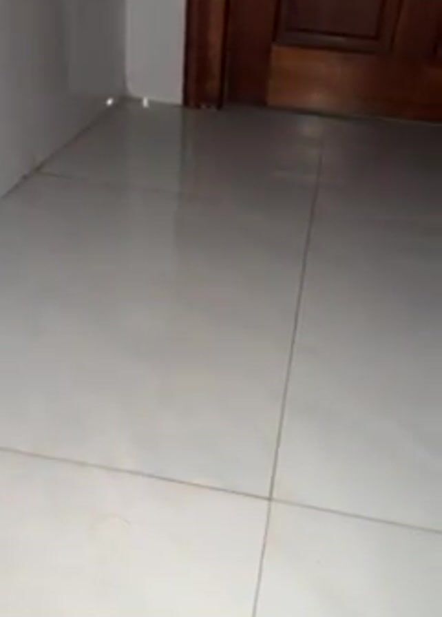 close-up view of a tiled floor, partially obscured by shadows. The tiles are light-colored and appear to be square or rectangular. Along the top edge of the frame, a portion of a dark wooden door is visible. To the left, there is a white wall meeting the floor. The video is static and appears to be a low-angle shot, focusing mainly on the flooring and lower portion of the door.