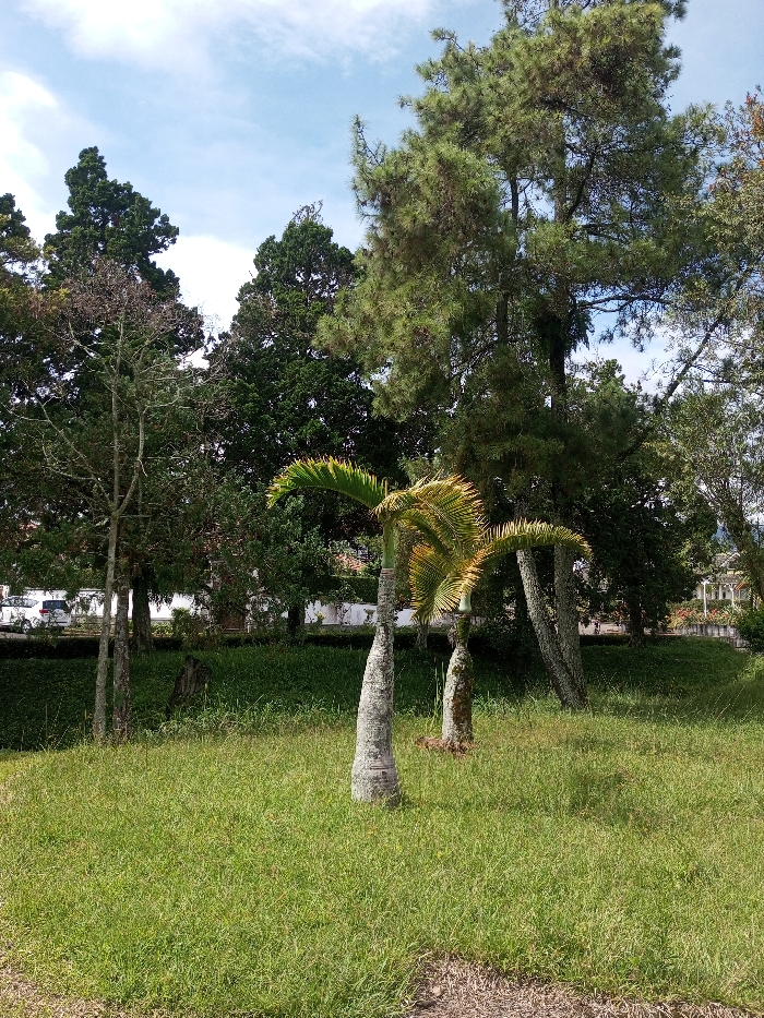 Lush green grass covers the foreground, leading to a collection of trees in the background. Two short palm trees stand out in the middle, their slender trunks textured and topped with vibrant green fronds. Behind them, a mix of tall, mature trees with varying foliage fills the scene, their canopies reaching towards a blue sky dotted with clouds. The landscape slopes gently, hinting at a park or garden setting with a well-maintained aesthetic.