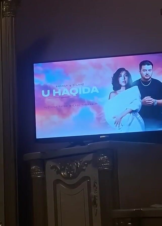 A TV on a carved stand displays a music video. The screen reads "KONSOLA x DILNOZ U HAQIDA." It features a man and woman, possibly singers. The woman is in white, holding her belly. The background is a light blue and pink gradient. The TV is in a room, possibly a bedroom or living room with classic furniture.