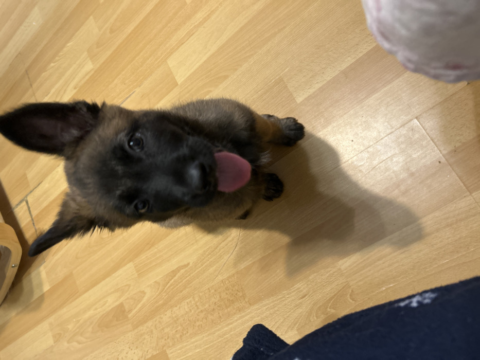 In the city of Hrabarsko, Bulgaria, a young canine, identified as a puppy, is captured seated directly on a light-colored wooden plank floor. The puppy exhibits short, dark brown and tan fur, a black muzzle, and two prominent, erect ears. Its dark eyes are fixed forward towards the camera, and a pink tongue is visible, extended slightly from its mouth. A distinct shadow from the animal is cast directly behind it on the wooden surface. In the upper left background, a segment of a light-colored wooden furniture item is partially visible. The lower left foreground displays a portion of dark blue fabric, possibly a garment, with subtle lighter-colored patterns. In the lower right foreground, an out-of-focus light-colored object, consistent with fabric showing faint pink markings, is present. No human subjects are visible within the frame.