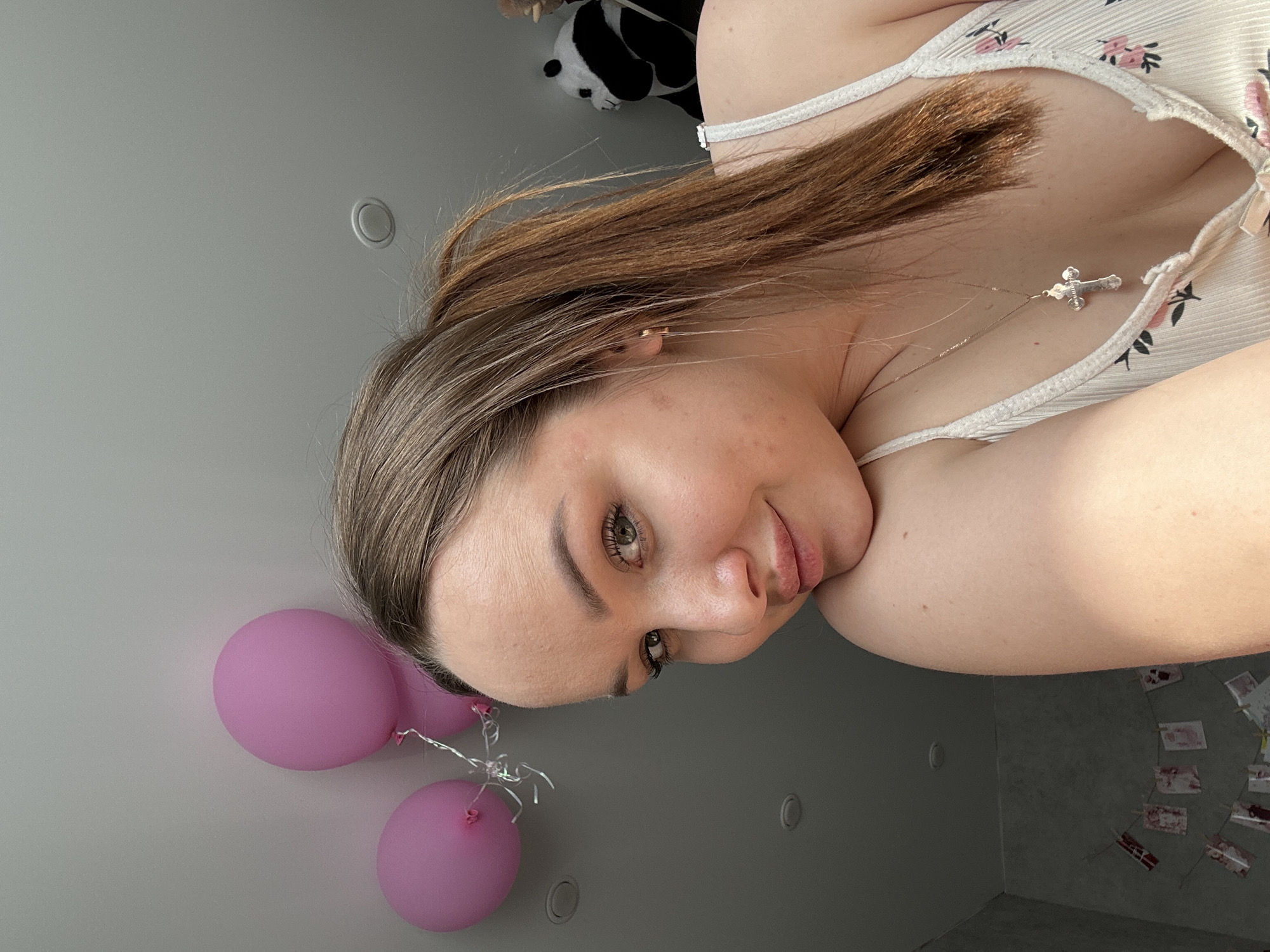 This image, captured in an indoor setting within Chaikovsky, Russia, features a young adult female positioned closely to the camera. She has light skin, brown hair styled in a ponytail, and light-colored eyes, looking directly towards the viewer with a subtle smile. She is wearing a white, ribbed tank top with a pink floral pattern and a silver-colored chain necklace with a cross pendant. A small gold-colored hoop earring is visible in her right ear. The background consists of a light grey wall and a white ceiling with two visible recessed light fixtures. Three pink balloons with silver ribbons are tethered and floating near the ceiling on the left side of the frame. A black and white plush panda toy is partially visible behind her right shoulder. On the lower left wall, a string displays multiple small, rectangular items, possibly photos or cards with red accents.