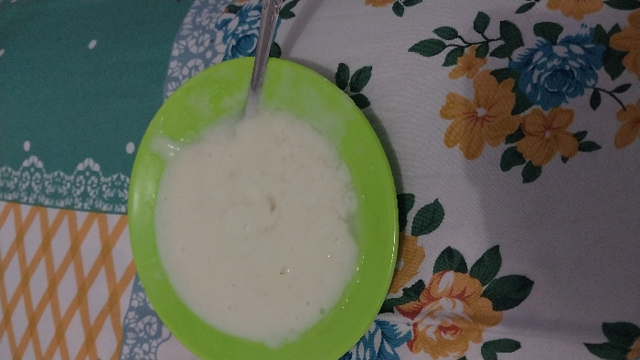 Lhoksukon, Indonesia. The image depicts a bright green, circular, shallow dish centrally positioned, containing a white, viscous, semi-liquid substance with minor textural variations. A silver-colored spoon is partially submerged in the substance, resting on the right side of the dish. The dish rests on a multi-patterned fabric surface. The lower and central foreground of the fabric displays a white background adorned with a floral pattern featuring yellow, orange, and blue blossoms with green leaves. In the upper background, the fabric transitions to distinct sections: a turquoise-teal area with white polka dots and a white scalloped or lace-like border, adjacent to an orange section with a white diagonal grid pattern. No people are visible.