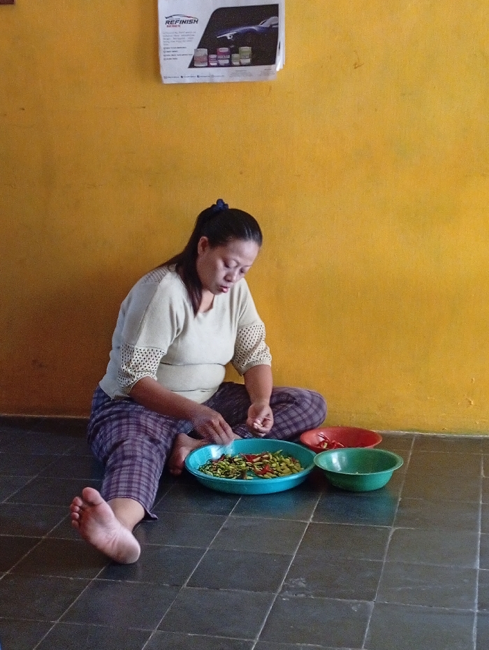 A woman sits cross-legged on a gray tiled floor against a yellow wall. She wears a light-colored top and plaid pants. Three bowls sit in front of her, one filled with green and red items, possibly vegetables. Her right foot is bare and visible. A poster hangs on the wall behind her, partially obscured by the camera angle. The scene appears casual and domestic.