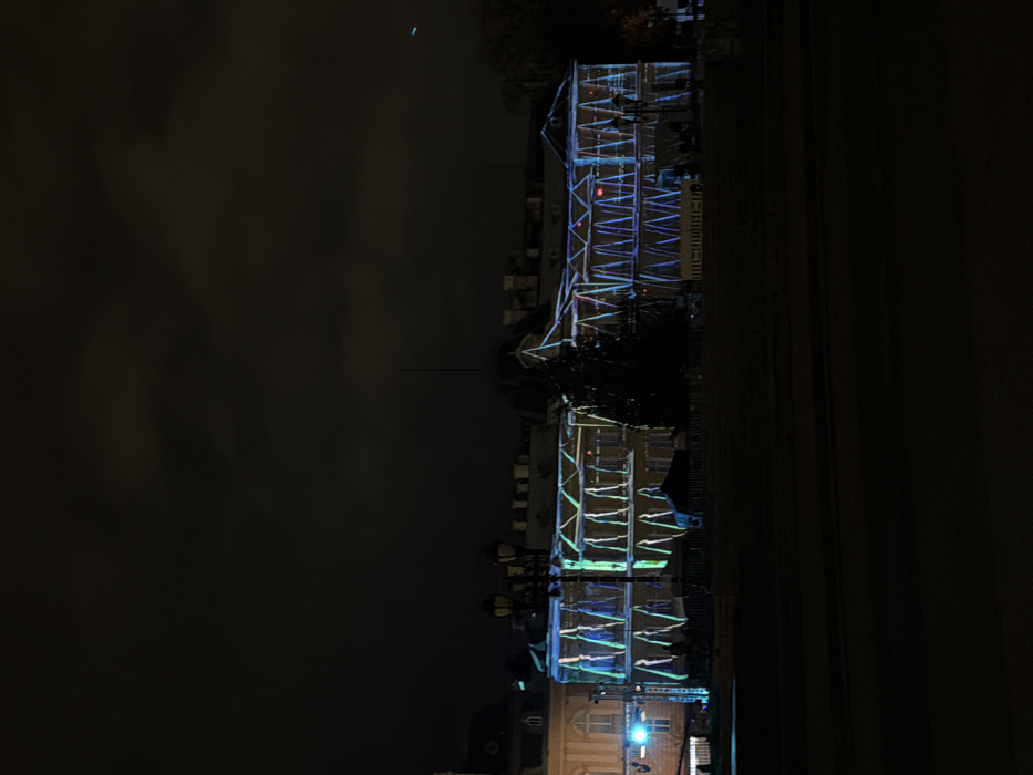 A nighttime scene in Sofia, Bulgaria, displays the National Art Gallery (former Royal Palace) on Knyaz Alexander I Square, illuminated by an elaborate light projection. The building's facade is covered with dynamic, geometric light patterns in blue, green, and purple hues, creating an illusion of depth and movement. A dark, conical evergreen tree is positioned centrally in front of the illuminated building. To the left, an ornate black street lamp with two globes stands. Faint outlines of temporary structures are discernible at the base of the building. The foreground is a dark, empty expanse, likely a plaza. The sky above is dark and overcast, with a faint blue light streak visible in the upper right quadrant. No individuals are visible.
