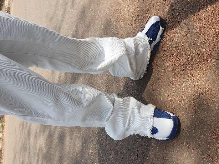 The image displays the lower extremities of an individual standing outdoors in the city of Ogbogbo, Nigeria. The subject wears loose-fitting, light-colored (likely white or off-white) trousers with a visible ribbed texture, possibly corduroy or heavily textured denim. The pant legs are wide, and their frayed hems rest over the footwear. The individual is wearing two low-top athletic shoes, predominantly dark blue and white. The shoes feature white toe sections, dark blue mid-foot areas, and dark blue soles. The ground surface is dark grey asphalt or pavement, covered with scattered brown organic debris, consistent with dried leaves or plant matter. Distinct shadows are cast on the ground, indicating direct overhead sunlight.