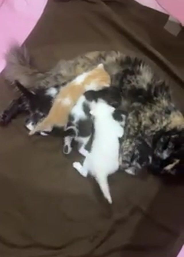 A tortoiseshell cat lies on a brown blanket. She is surrounded by five kittens that are nursing. One is orange, one is white, one is black and white, and two are black. The blanket sits atop a pink surface that is likely a bed or mattress. The camera is positioned overhead.