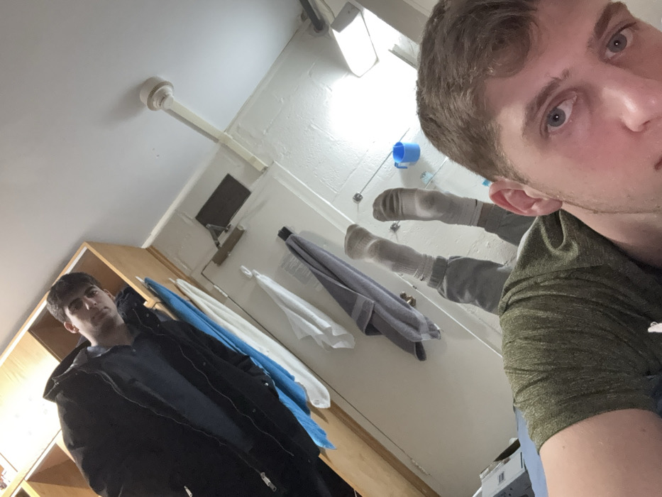 Two men are visible in a skewed indoor shot. One man, wearing a dark coat, stands by a wooden cabinet with clothes. The other man is positioned closer to the camera, only his head and shoulder are visible. Behind them, mounted on the wall, are a few towels hanging with a pair of socks visible in between. A wall-mounted television is also visible. A light fixture is installed near the ceiling.