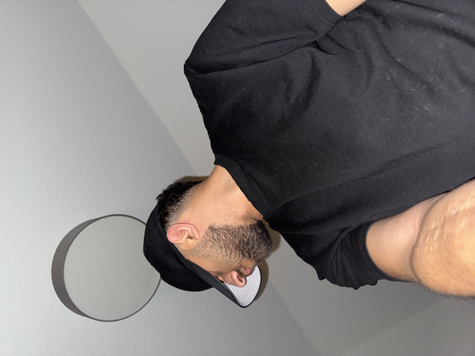 A man with dark hair and a beard wears a black t-shirt and a black baseball cap with a white brim. He is facing downwards and slightly to the left. A round mirror is mounted on the light gray wall behind him. The angle suggests the photo was taken from a high vantage point, potentially a selfie. The focus is sharpest on the man's face and upper body.
