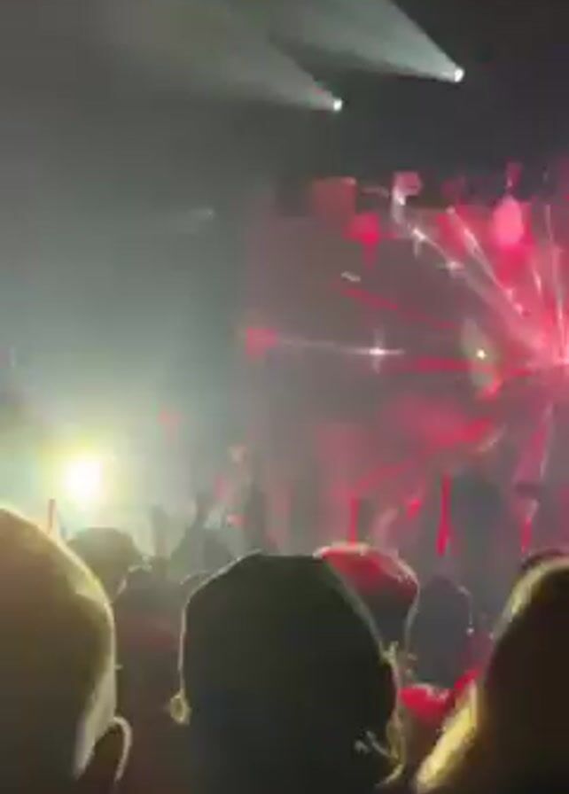 concert with a band performing on stage under red and white spotlights. A large screen behind the band displays red and white patterns. The crowd is visible in the foreground, with many people raising their hands. One of the band members is playing a guitar and singing into a microphone. The atmosphere seems energetic and lively.