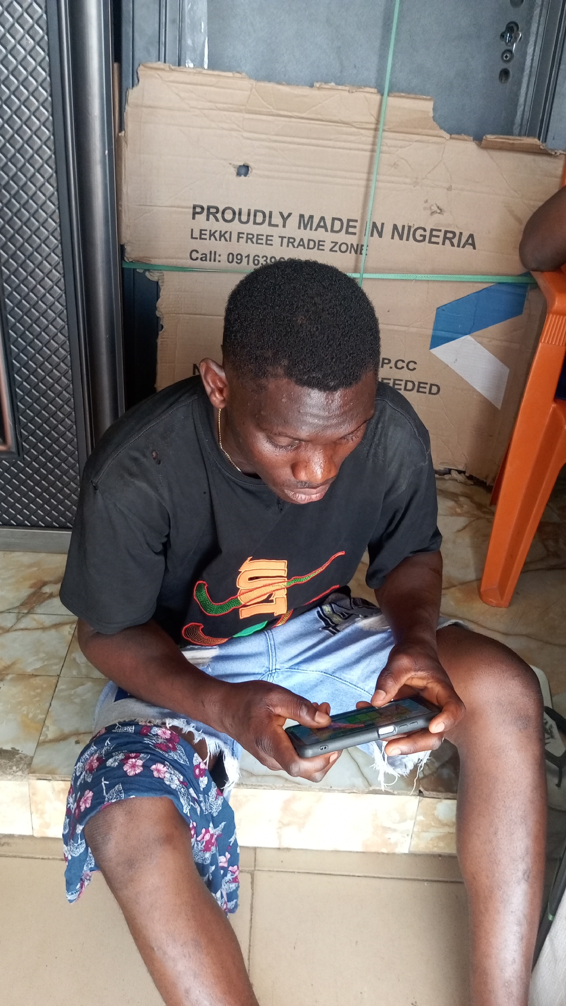 An adult male is seated on a tiled floor, possibly a step or elevated surface, in what appears to be an outdoor or semi-enclosed area within Ogbunike, Nigeria. The man, with dark skin and short black hair, is wearing a black t-shirt with an orange and green graphic design, exhibiting minor wear and tear near the left shoulder. He is also wearing light blue denim shorts, which appear distressed. A dark blue fabric with a pink and white floral pattern is draped over his left knee. He is holding a black smartphone horizontally with both hands, focusing intently on its screen, with his thumbs positioned as if interacting with an application. A thin gold-colored chain is visible around his neck. In the background, to the subject's right, several cardboard boxes are stacked. One box clearly displays the text "PROUDLY MADE IN NIGERIA" and "LEKKI FREE TRADE ZONE," with a partial contact number "Call: 091639..." and "P.CC" visible. To the subject's left, a dark, possibly metallic, door or gate with a patterned, embossed surface is present. The floor is covered with light-colored tiles featuring a darker grout. A portion of an orange plastic chair is visible on the far right side of the frame.