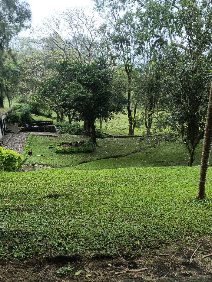 A serene landscape with a sloping green lawn dominating the foreground. A stone structure with water features nestles among trees in the midground. Various trees and lush vegetation fill the scene, creating a natural, peaceful setting. A glimpse of a building is visible to the left, while a palm tree stands to the right. The sky is overcast, contributing to the tranquil mood of the image.