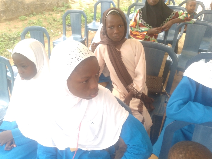 This image depicts a daytime gathering in Ijoko, Nigeria. Multiple individuals, primarily children and young women, are seated on blue plastic chairs in what appears to be an outdoor or semi-sheltered area with an earthen ground. In the foreground on the left, two young girls are seated. The leftmost girl is partially obscured, wearing a white hijab and a blue garment, looking downwards. To her right, a second girl, also in a white hijab (adorned with small dark embellishments) and a blue top, looks towards the right. On the right side of the foreground, the upper body of another individual in a white hijab and blue garment is partially visible. In the mid-ground, slightly to the left of center, a young girl with a light brown hijab and a long-sleeved, light-colored dress is seated, looking directly at the viewer with a neutral expression. Her arms are crossed in her lap, and her sleeves feature patterned cuffs. Behind her, on a blue plastic chair, a dark brown, patterned handbag is visible. Further back and to the right, an adult woman in a black hijab and a colorful, long-sleeved patterned dress is partially visible, leaning forward and to the right, with her hands clasped. A small child's head is partially visible in the far background on the right. Numerous empty blue plastic chairs are scattered in the background, suggesting a larger seating arrangement. A light-colored wall or structure is visible in the upper left background.