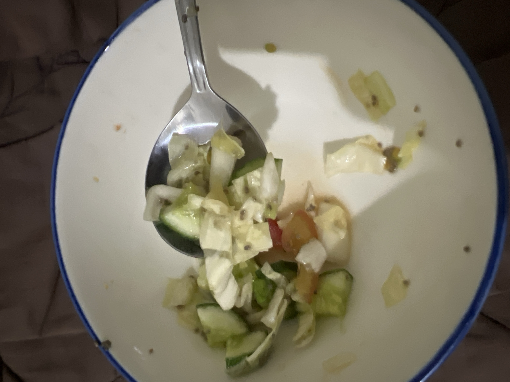 A close-up, top-down view shows a white ceramic bowl with a thin blue rim resting on a dark, possibly fabric, surface in Cam Đức, Vietnam. The bowl contains a partially consumed salad consisting of diced green cucumber, shredded pale green and white cabbage-like vegetables, and small chunks of red and orange produce, possibly tomatoes or bell peppers. Numerous small, dark brown seeds, resembling chia or poppy seeds, are mixed within the salad and scattered on the white interior surface of the bowl. A stainless steel spoon is positioned in the upper right quadrant of the bowl, partially submerged in the salad mixture, suggesting active consumption. The lighting is dim, casting a shadow from the spoon onto the bowl's surface. Small food residue spots and additional scattered seeds are visible on the clean areas of the bowl. No individuals are visible in the frame.