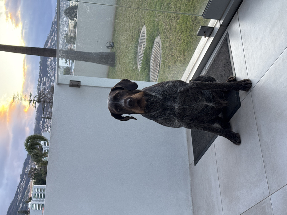 - "The image captures a German Wirehaired Pointer or similar breed dog seated on a tiled patio or balcony overlooking the city of Funchal, Portugal, during twilight" by FM-8ALHx1, licensed under CC BY 4.0