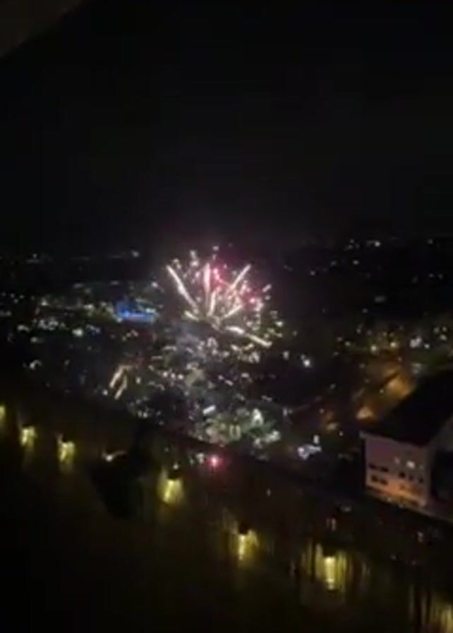 nighttime urban landscape with fireworks being set off. The view appears to be from a high vantage point, possibly a tall building or balcony. The city below is lit with streetlights and building lights. Fireworks explode in the sky, creating bursts of light and color, specifically white, gold, and red. The fireworks appear to be launched from a location within the city. The video is somewhat shaky. A portion of a structure, possibly part of the balcony or window frame, is visible at the top of the frame.