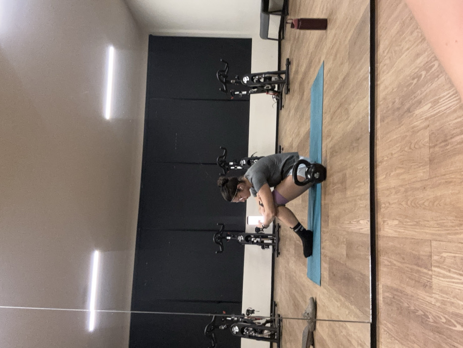 The image depicts an indoor fitness facility located in Komchén, Mexico. The scene is observed through a large, vertical mirror that reflects the entire room. The floor is light brown with a wood-grain pattern. The rear wall is dark, appearing black or dark gray and segmented, while the wall on the right is light beige. Overhead, linear fluorescent lights are visible, casting reflections. Several black spin bikes are arranged in the background. A dark gray workout bench is partially visible against the right wall. In the mid-ground, a single individual, appearing female, is seated on a rectangular blue exercise mat. She is wearing a gray t-shirt, light-colored shorts, black socks, and glasses, with her hair pulled back. She is positioned with her knees bent and drawn towards her chest, arms wrapped around her shins, and is looking down at a brightly illuminated smartphone held in her hands. A purple resistance band is positioned around her upper thighs. A black kettlebell rests on the mat directly in front of her. To the left of the mat, a pair of light brown slip-on shoes are on the floor. On the far right, a dark red water bottle stands upright on the floor.