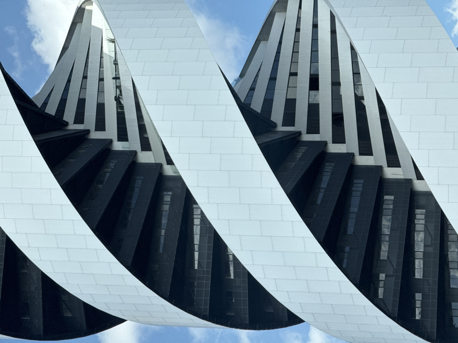 n abstract view of a modern building with a unique, curving facade. Alternating bands of white, tile-like material and dark, glass-covered sections create a dynamic, twisting effect. Vertical lines of windows are visible between the bands. The sky is partially visible in the background, adding to the abstract architectural scene.