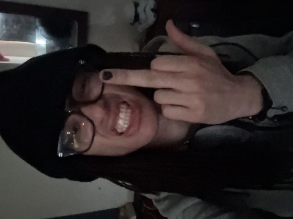 A person wearing a black beanie and glasses is giving the middle finger. They are smiling, showing braces. The person has dark hair, a gray hooded sweatshirt, and a beaded bracelet. A partial reflection is visible in the upper left of the photo, and some unidentifiable objects are in the background.