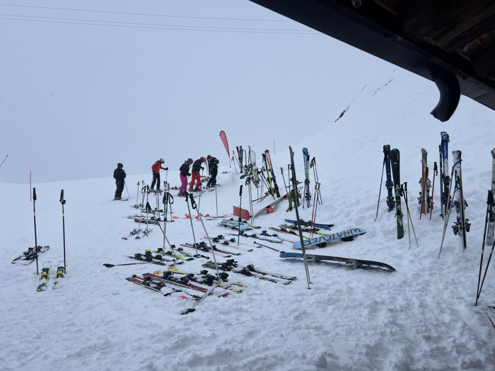 The image depicts a snow-covered mountain slope at a ski resort in Valtournenche, Italy, under an overcast sky with visible precipitation. Six individuals in full ski attire are present in the mid-ground. To the far left, one person in a black jacket and dark pants stands, facing right, holding ski poles. To their right, five additional individuals are grouped, dressed in colored ski jackets and pants (red, pink, dark grey), primarily bent over, appearing to adjust ski equipment. The foreground and mid-ground are densely populated with multiple sets of skis and ski poles, both lying flat on the snow and standing upright, stuck into the snow. At least two snowboards are visible on the snow, one clearly marked "WHATEVER." A red triangular banner stands upright on the far right. An architectural overhang, likely part of a building structure with a dark gutter, is visible in the upper right quadrant of the frame.