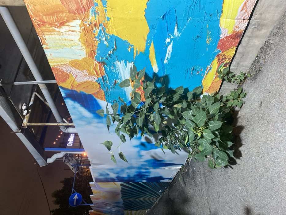 The image displays a nighttime street scene in Tel Aviv, Israel, specifically at HaRakevet 13. In the foreground, a concrete sidewalk slopes downwards from left to right. A multi-paneled wall, approximately 1.5-2 meters high, dominates the midground. From the base of this wall, a leafy green plant with broad leaves, approximately 1 meter tall, grows upwards, casting shadows to its right. The wall itself is adorned with vibrant, abstract murals featuring large, textured brushstrokes in shades of blue, yellow, orange, and white. Some sections of the mural include patterns resembling fronds in blue and white. Above the wall, in the upper-left quadrant, a blue circular street sign with a white right-pointing arrow is visible. To the right of the sign and above the wall, parts of an urban structure are visible, including exposed grey pipes, conduits, and a corrugated metal awning or roof section. A prominent backlit sign with white lettering on a dark background reads "DeBlox." Several small, warm-toned lights are also visible on the structure. The sky is dark, indicating night. No people or animals are present in the scene.