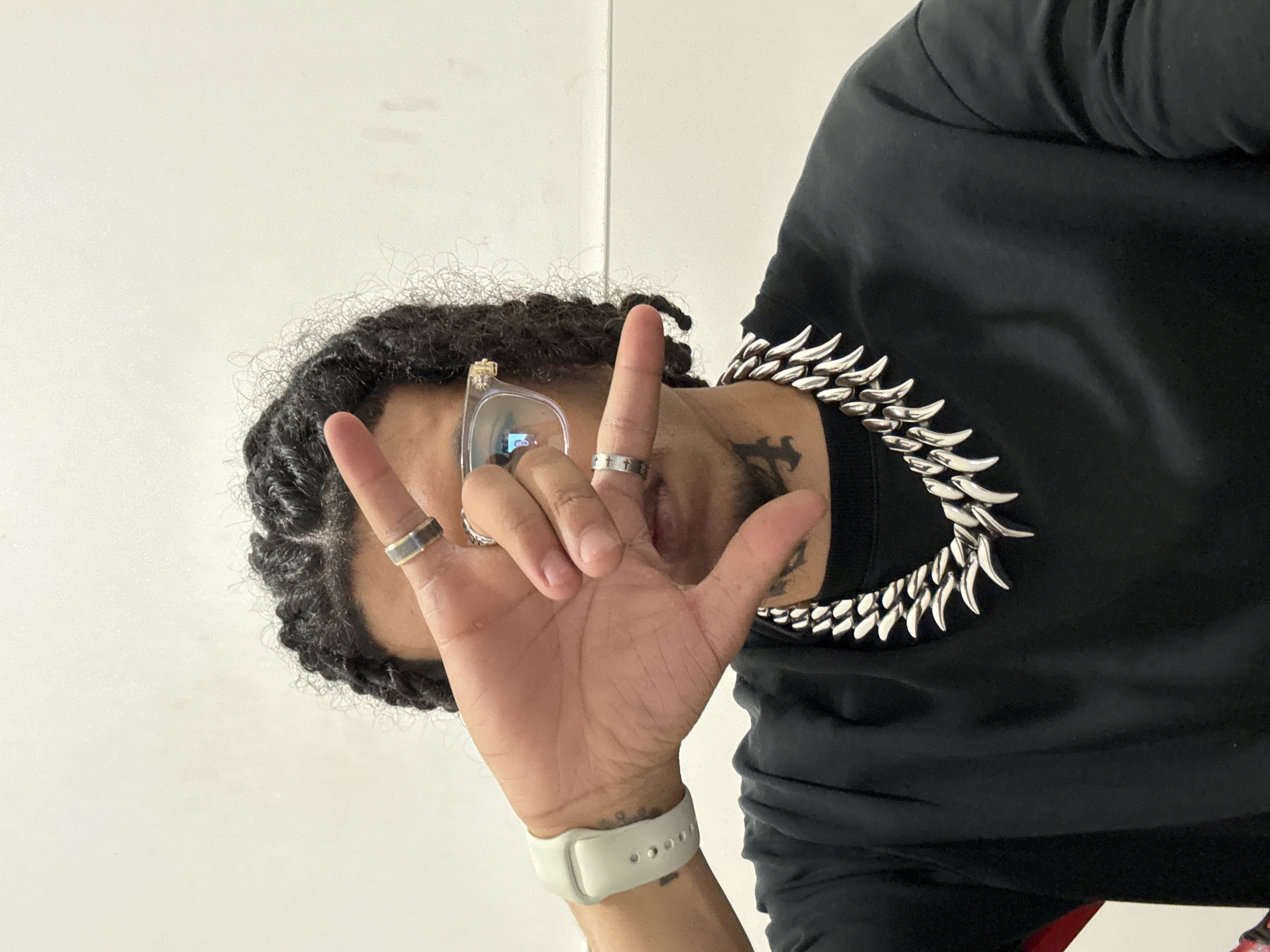 An individual with dark braided hair and light-frame glasses is depicted in a close-up, chest-up portrait against a plain white wall. The person's left hand is raised, partially obscuring the upper face, forming a V-shape with the index and middle fingers. The hand displays multiple rings: a wide two-tone ring on the index finger, a silver ring with cross motifs on the middle finger, and a plain silver ring on the ring finger. A white smartwatch with a silicone strap is visible on the left wrist. The individual wears a black long-sleeved shirt and a prominent silver-colored chain necklace composed of pointed, fang-like links. A tattoo, appearing to be a stylized number "4" or similar symbol, is visible on the left side of the neck. Reflections in the glasses show a faint, blurred image. The scene is illuminated by overhead or frontal lighting, suggesting an indoor environment in Massy, France.