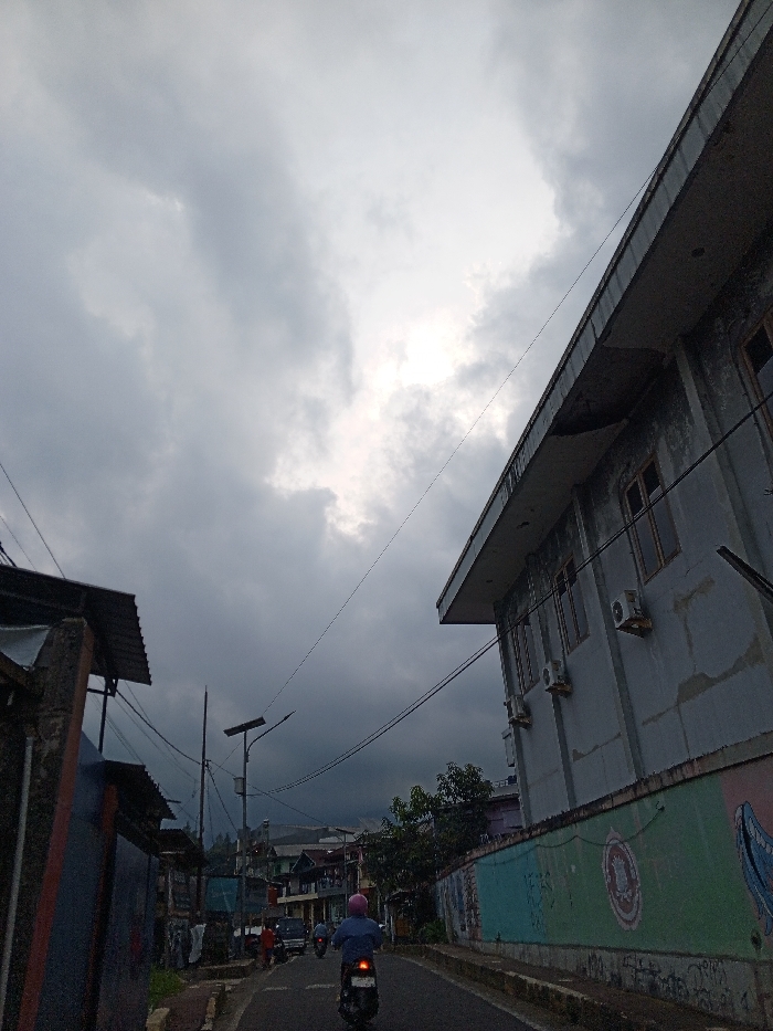 The image depicts a street scene in Chennai, India, under a heavily overcast sky dominated by dark grey clouds with a bright patch indicating the sun's location in the upper right. A dark-colored scooter, ridden by an individual wearing a light-colored jacket and a pink helmet, travels away from the viewer on a paved road that appears damp. On the left, a partially obscured, dark, single-story structure with a corrugated roof stands in the foreground, followed by utility poles laden with numerous overhead wires and a street light featuring a solar panel. Further down the street, additional multi-story buildings and vegetation are visible, with another person on a scooter and a figure in red visible on the left side of the road. On the right, a two-story building with a weathered light grey facade features an overhanging roofline. Several rectangular windows with dark frames are present on the upper level, and three outdoor air conditioning units are mounted below them. The lower portion of this building's wall displays a faded mural in shades of light blue, green, and pink, depicting abstract shapes and a partial facial element resembling an eye and mouth. A thin utility wire spans diagonally across the frame.