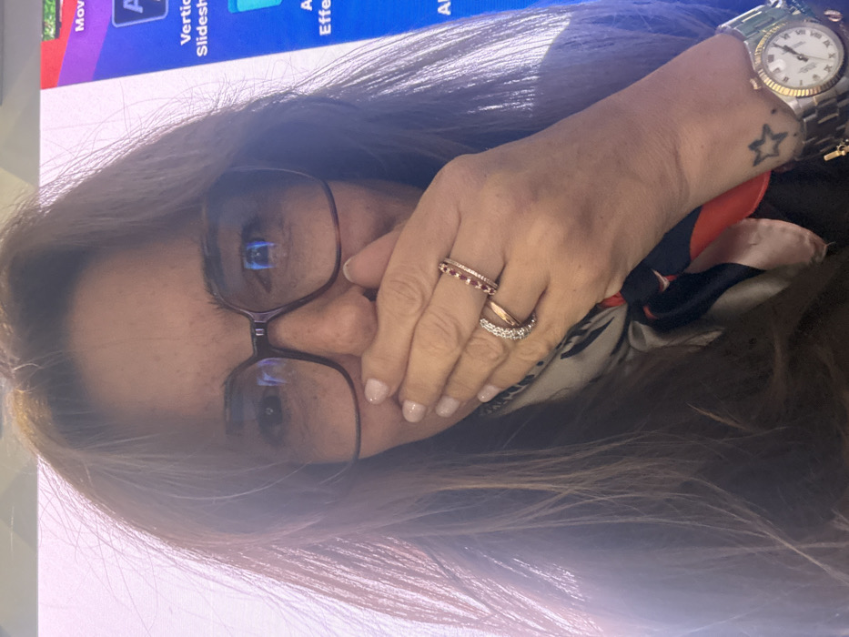 A medium close-up image depicts a woman covering her mouth with her right hand, photographed indoors in Chassieu, France. The woman has long, medium-brown hair and wears tortoise-shell framed eyeglasses, through which her eyes are visible looking towards the camera. Reflections of a bright, multi-colored digital display with user interface elements (e.g., "Move," "Vertical," "Slideshow," "Add," "Effects") are present in her eyeglass lenses and in the background. On her right hand, which features light-colored nail polish, she wears three rings: a gold-toned band with a row of red stones on her ring finger, a wider band with white stones in a crisscross pattern on the same finger, and a plain gold-toned band on her middle finger. A multi-colored scarf with a pattern (black, white, red, light pink) is visible around her neck. On her left wrist, a gold and silver-toned wristwatch with a white face and Roman numerals is visible, adjacent to a black outline star tattoo. The lighting is bright and somewhat soft.