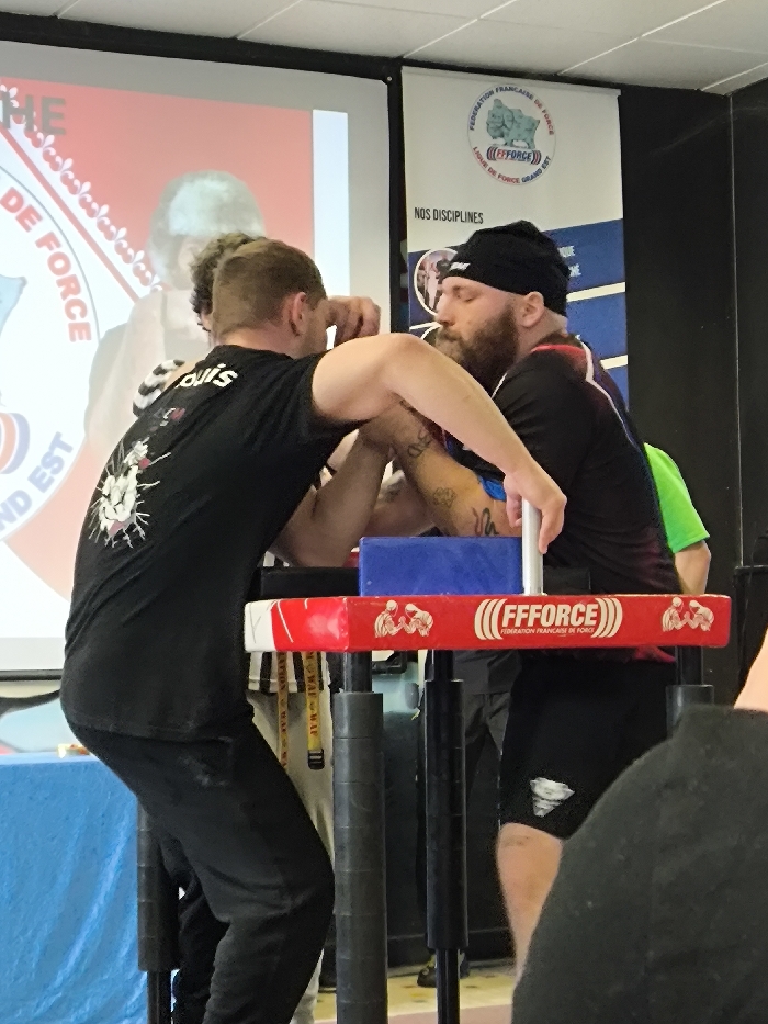 The scene depicts an indoor arm-wrestling competition taking place in Woippy, France