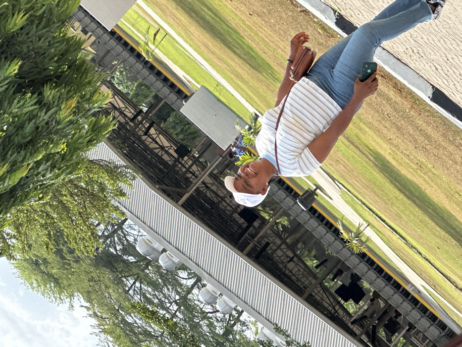 The scene is set outdoors in Ozuaha, Nigeria, under natural daylight. A woman stands prominently in the foreground, angled to the right relative to the tilted image frame, with her head turned to her left, displaying a wide smile. She is wearing a white baseball cap, a short-sleeved t-shirt with light-colored horizontal stripes, and light blue jeans. A brown leather shoulder bag with a thin strap is visible across her torso, and she holds a dark-colored smartphone in her left hand, which is positioned down by her side. In the mid-ground, extending from the left to the upper center, is a large, open-sided structure with a light-colored corrugated metal roof. Several white, dome-shaped roof ventilators are visible along the roof's ridge. The roof is supported by an exposed metal truss framework. Behind this structure and further to the left, dense green tree foliage is visible against a bright, hazy sky. To the right of the covered structure, multiple rows of dark-colored seats, characteristic of a spectator area or stadium, are visible in the background. A large expanse of green and light brown grass covers the ground, with a lighter-colored paved path or curb with black markings delineating the lower-right edge of the image. A faint figure in a blue shirt is partially visible in the distant background near the seating area.