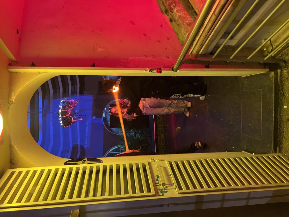 An outdoor scene features a yellow-trimmed, arched window offering a glimpse of a blue-lit interior. Two figures, a person holding a lighter and another with sunglasses, stand in the opening. A gate or fence with horizontal bars dominates the lower portion of the frame. The top is a mix of red walls and weathered concrete with metal railings.