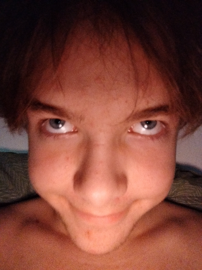 A close-up, slightly distorted, shot of a young person's face. They have light skin, a prominent nose, and light-colored eyes that gaze directly at the camera. Their hair is reddish-brown and falls in a fringe across their forehead. The lighting is dim, creating shadows and highlighting the angles of their face. The person's lips are slightly stretched, hinting at a suppressed smile or smirk. The angle is from below, exaggerating their features. A hint of green fabric is visible in the background, likely a pillow or blanket.
