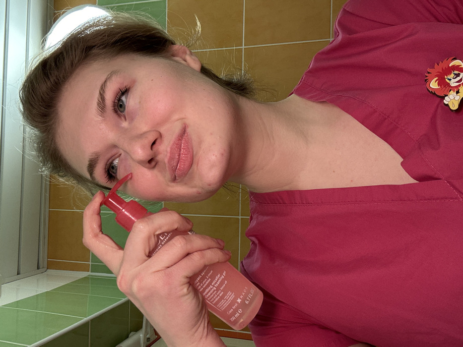 A woman wearing red scrubs holds a bottle of Bioderma Sensibio foaming gel