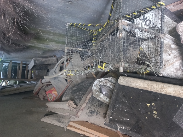 The scene, located in Bogor, Indonesia, depicts a narrow, heavily cluttered outdoor passageway or storage area. A significant accumulation of assorted debris and discarded materials occupies the space. In the mid-right foreground, a rectangular grey metal wire cage, approximately 0.5 meters in length, is visible, partially wrapped with yellow and black striped caution tape. Inside the cage, dark, indistinct objects are present alongside a white plastic item featuring the partial inscription "OK." To the left and behind the cage, a large pile of various materials includes wooden planks, grey concrete or stone fragments, curved plastic pieces, a red and gold packaged item, a crumpled grey fabric sack, and a black mesh panel. A light-colored cylindrical pipe lies horizontally across the black mesh panel in the immediate foreground. The environment consists of two concrete walls: the left wall is plain grey, while the right wall shows areas of green biological growth, likely moss or algae. In the background, a rudimentary wooden ladder or staircase structure ascends vertically. The ground is obscured by dirt and various small pieces of refuse. Dark, coarse natural fibers or brush material overhangs from the top right of the frame. No individuals are present in the scene.