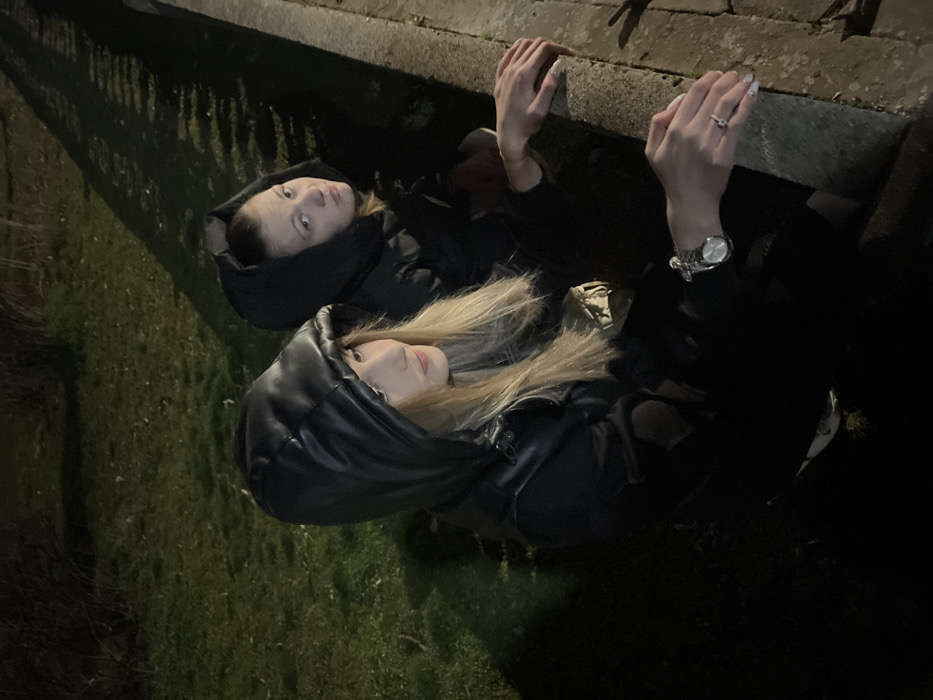 The image depicts an outdoor night scene in Cherven Bryag, Bulgaria. Two young adult females are present. The female positioned in the foreground on the left has long blonde hair visible beneath a black hooded puffer jacket and is oriented facing right. Her right hand, adorned with a silver-toned watch and a ring on the ring finger, rests on a low, weathered concrete barrier. The second female, positioned behind and to the right of the first, wears a dark hooded garment with dark hair and is facing the camera directly. Both subjects are illuminated by an artificial light source originating from the left, which casts long, distinct shadows across the green grass in the midground. Indistinct dark vegetation is visible in the distant background.
