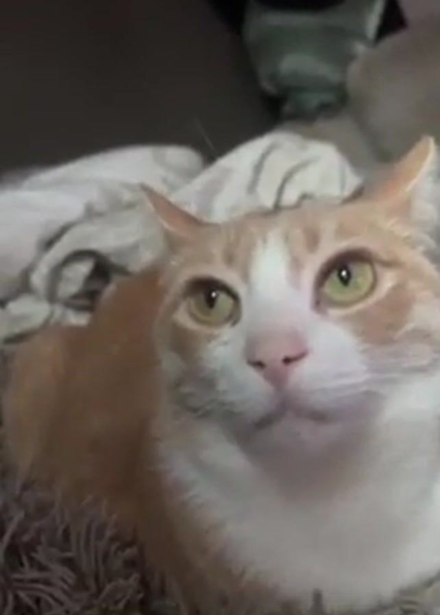 close-up of an orange and white cat lying on a textured blanket. The cat is looking slightly upward with its yellowish-green eyes. There are other blankets in the background. A person speaks in a low tone at the end of the video.