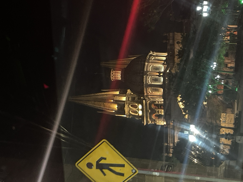 A nighttime shot features a tall cathedral with two spires illuminated by warm lighting