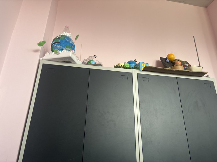 The image captures an indoor scene in Botevgrad, Bulgaria, featuring a light pink painted wall forming a corner on the left side of the frame. Against this wall, two dark gray metal storage cabinets, each with two doors and light gray trim, are positioned side-by-side. On the surface of the left cabinet, a handmade model of the Earth is centrally located. This model is painted blue and green, depicting continents and oceans, and features a visibly sad facial expression. A clear plastic bottle rests inverted on top of the Earth model. The model is situated on a white, irregular base, from which two green, leaf-like shapes on thin sticks protrude. Behind and to the right of this Earth model, several crumpled clear plastic bottles and a smaller blue and green globe-like object are scattered. On the surface of the right cabinet, various objects are arranged on a rectangular, dark brown, boat-shaped wooden tray or base. Visible items include a large, bright orange spherical object, a smaller blue spherical object, and several miniature block-like structures in green, blue, and yellow hues, some appearing to represent buildings. A dark, rectangular object, possibly a book or flat panel, is also present within the tray. A thin, vertical gray rod extends upwards from behind these items, and some green artificial foliage is visible around the base of the miniature blocks. The overall scene depicts a display of various crafted and miscellaneous items atop storage furniture.