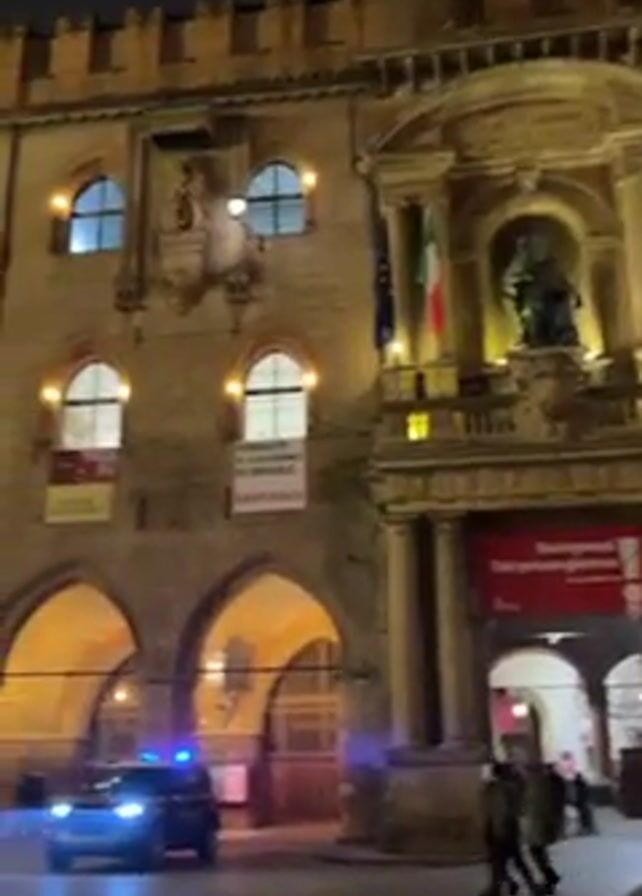 The camera pans up to show a stone building at night. The building has arched windows and doorways. A banner is displayed from one of the windows with the words "FERMATE IL GOVERNO DI ISRAELE" and "SAVE GAZA." A police car with flashing lights is visible in front of the building. Several people are walking near the entrance of the building.