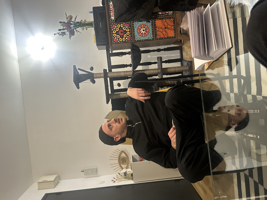 A man in a black tracksuit and cap sits cross-legged behind a glass table, his reflection visible. Behind him are a cat tree, a colorful decorative cabinet with flowers on top, and an open notebook. A decorative mirror hangs on the wall near a white storage unit, set against a light-colored wall and a dark door. The room is illuminated by a bright light source, likely overhead.